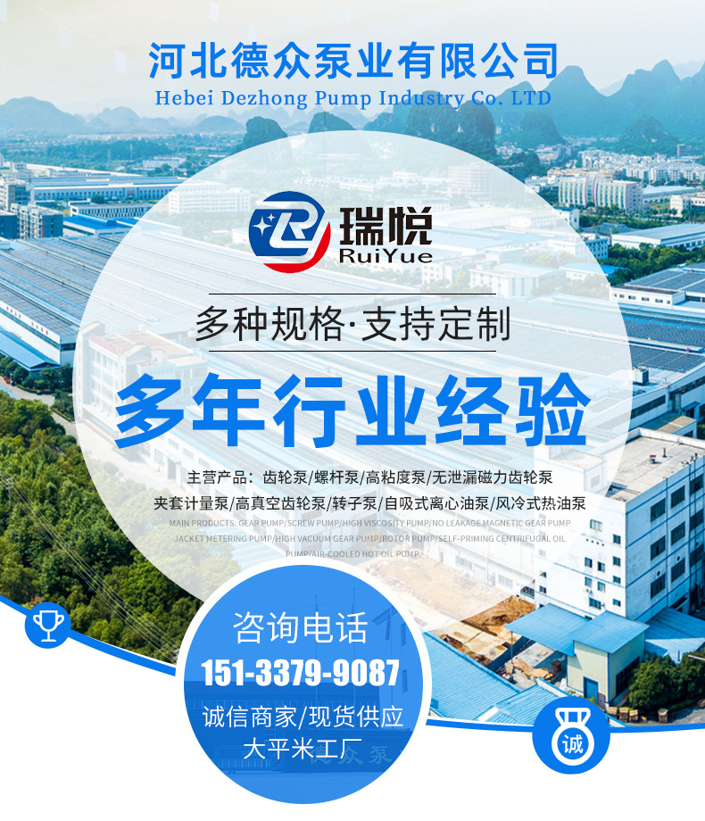 河北德眾泵業有限公司座落于久聞盛名的河北鑄造之鄉泊頭,公司占地面積23590平方米,是國內集研制、開發、生產、銷售、服務于一體的容積泵專業生產廠家,主導產品:齒輪泵、螺桿泵、高粘度泵、無泄漏磁力齒輪泵、夾套計量泵、高真空齒輪泵、轉子泵、自吸式離心油泵、風冷式熱油泵等工業泵產品。通過不懈地努力,依靠先進的技術,可靠的產品性能,精良的品質和優質的服務贏得了廣大客戶的認可和市場信譽,同時為中國石油能源一號網絡成員單位。